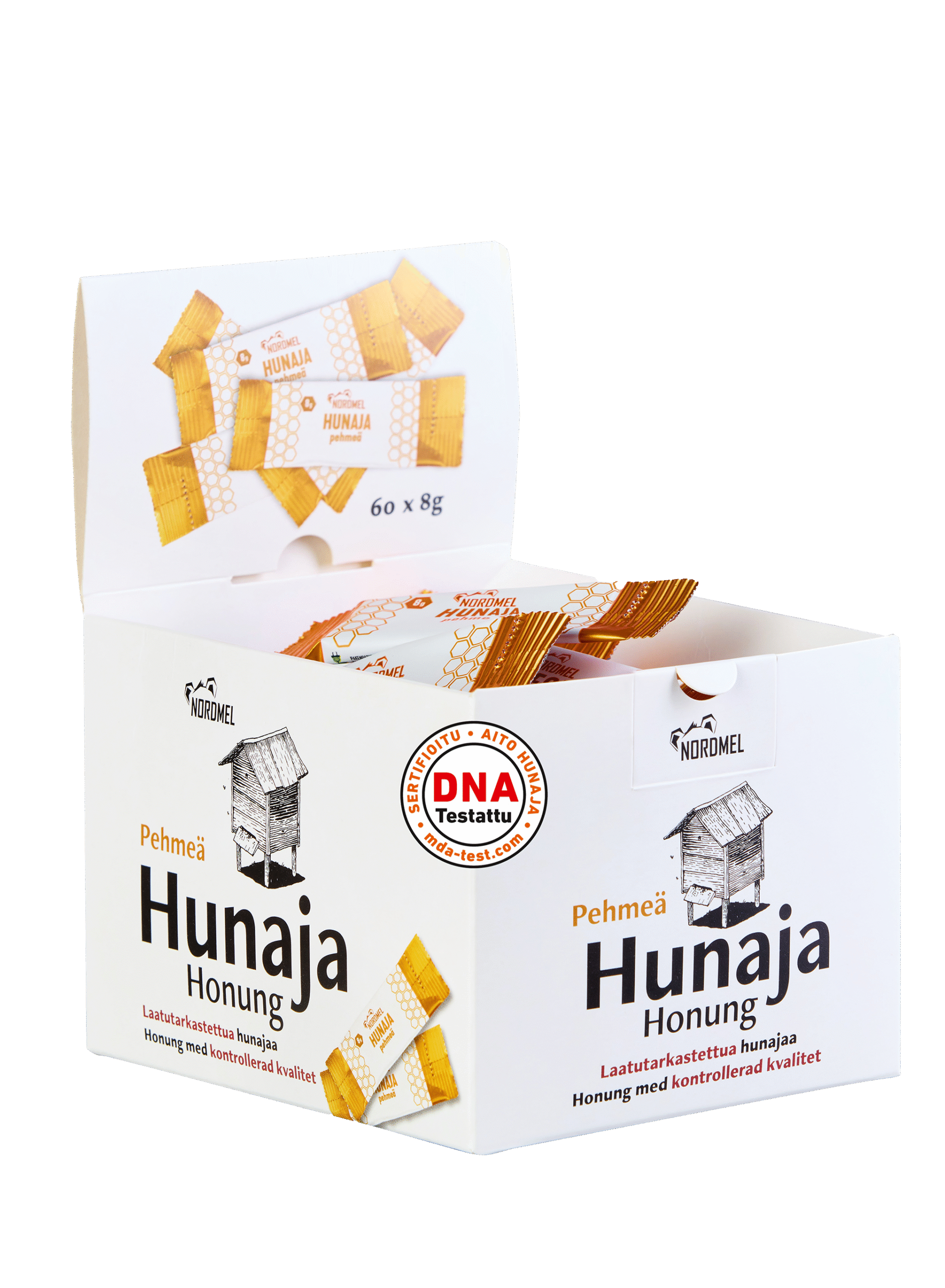 Nordmel hunaja 8g 60TKRavintosisältö 100 g kohti: Energia 1398 kJ / 329 kcal; Rasvat 0 g, josta tyydyttyneitä rasvahappoja 0 g; Hiilihydraatit 82 g, josta sokereita 81 g; Proteiini <0,5 g; Suola <0,01 g.